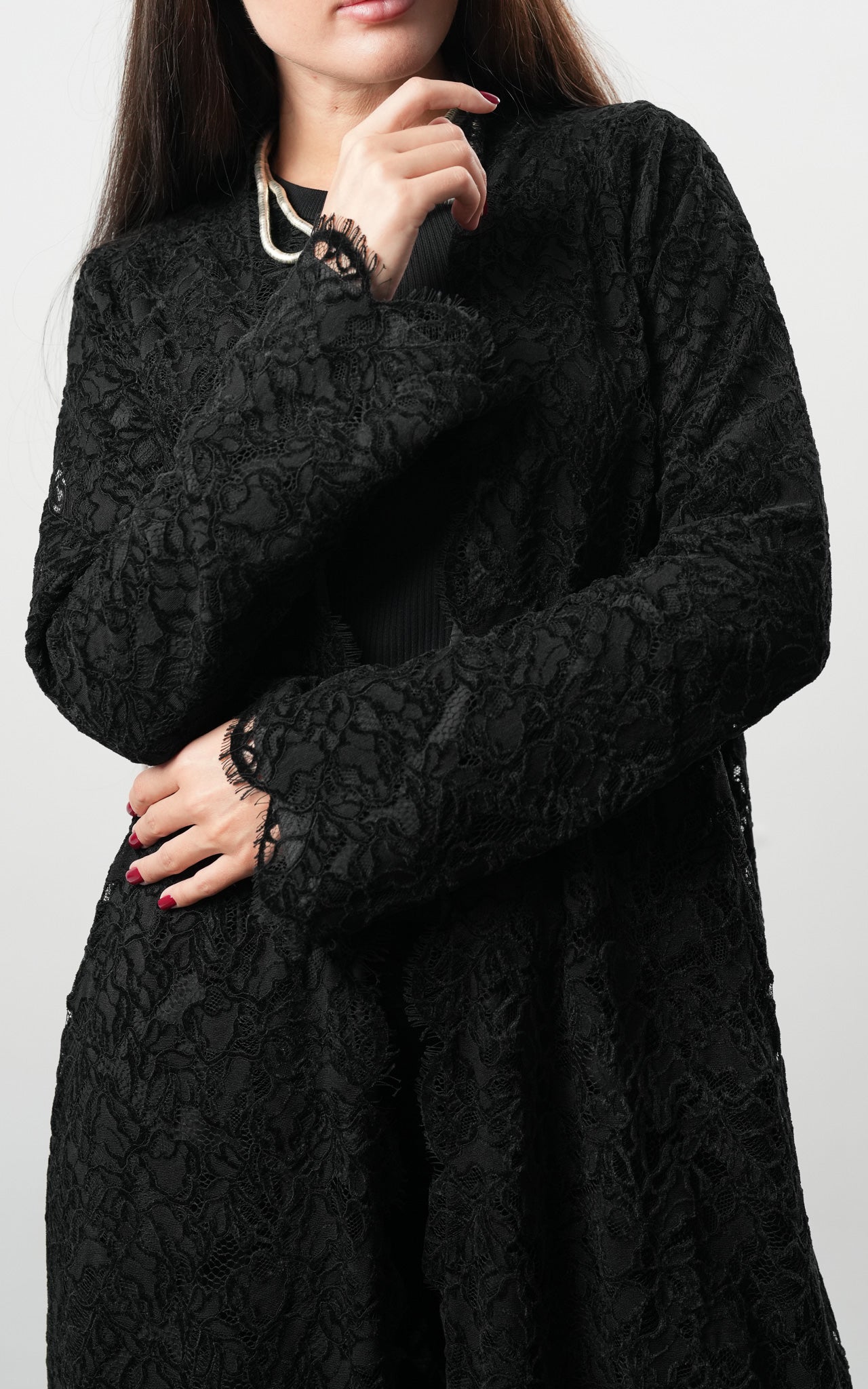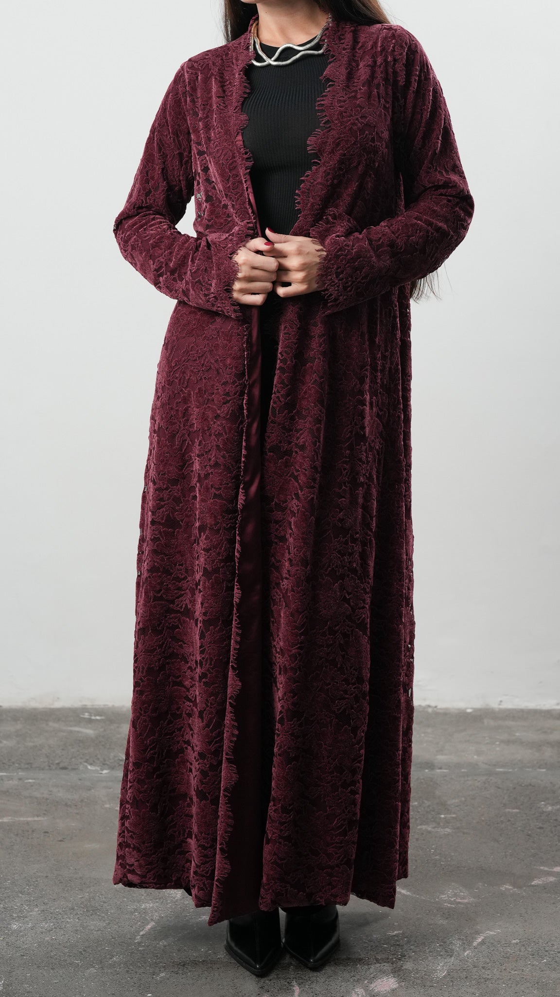 This stunning piece features luxurious velvet lace material, creating an enchanting contrast that's anything but ordinary. Luma abaya features A-line silhouette.